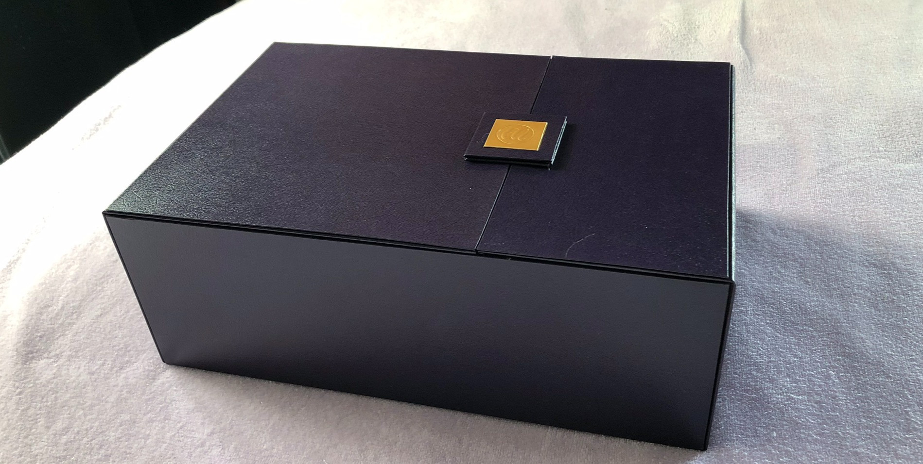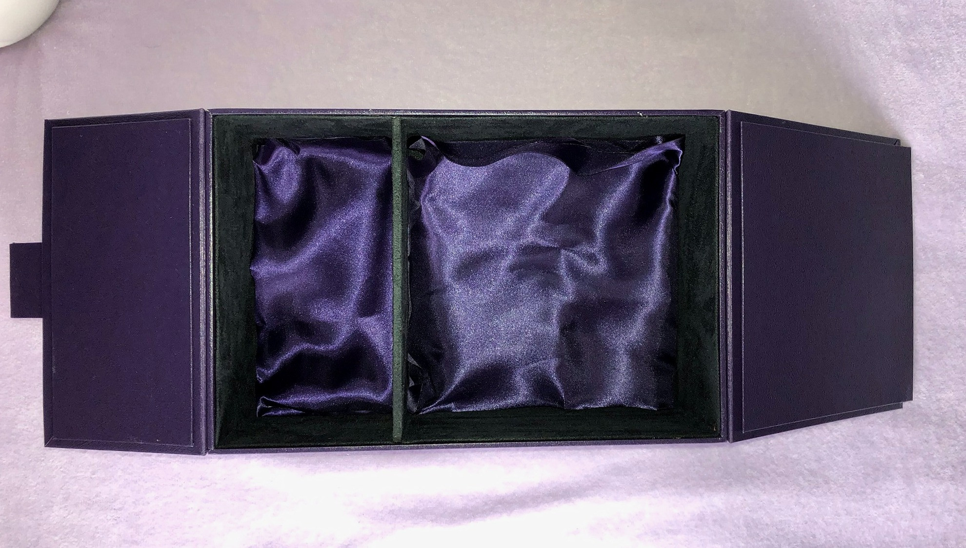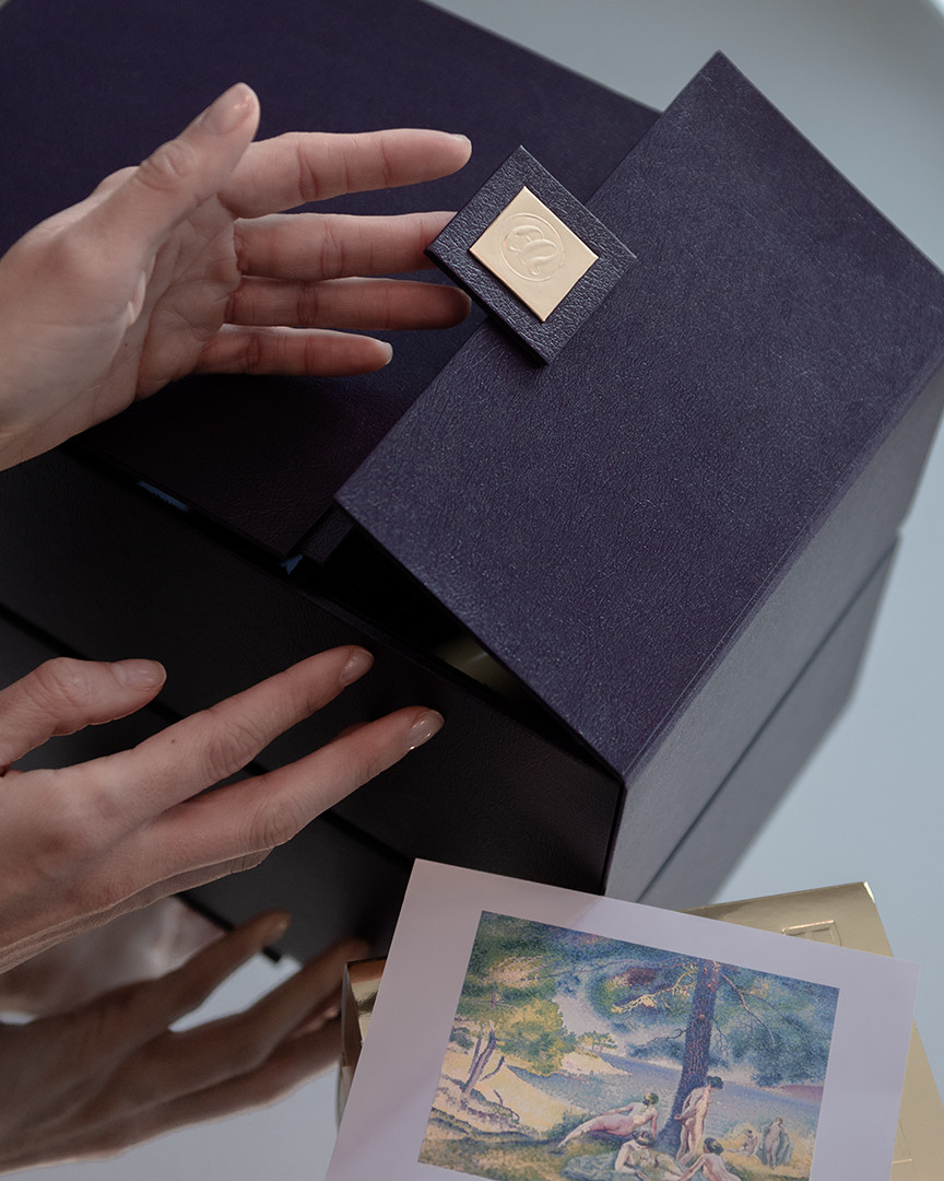 Elegantiška dovanų dėžė su magnetu. Dėžės viduje produktai įvyniojami į atlasinę skarelę, kvepiančią gėlių aromatu prisotintais Menard- Authent kvepalais.