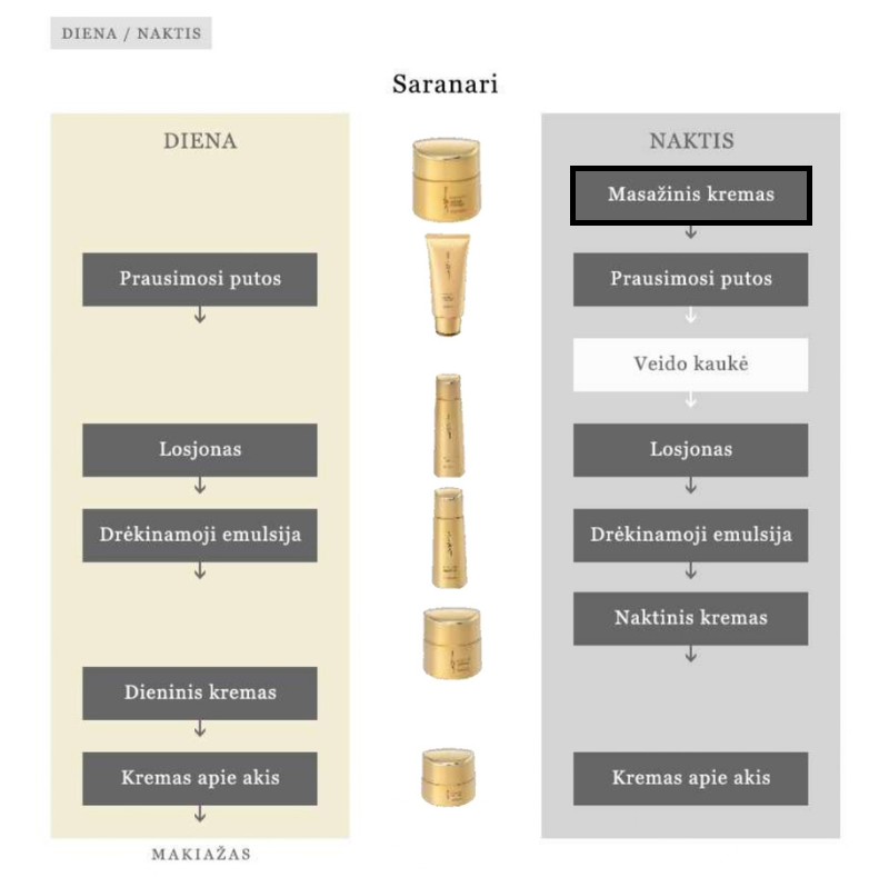 Kaip masažo priemonė: raudonosios pupelės dydžio kremo kiekį paskleisti po visą veidą. Masažuoti sukamaisiais judesiais 1-2 min. Priemonę kruopščiai nuplauti vandeniu.